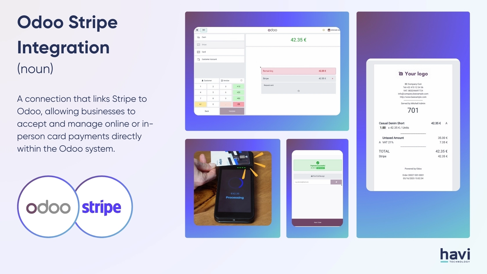 Odoo Stripe integration lets Australian businesses process payments through Stripe across three main flows: online checkout, customer-portal invoice payments, and in-person card transactions through s...source https://havi.com.au/blog/odoo-stripe