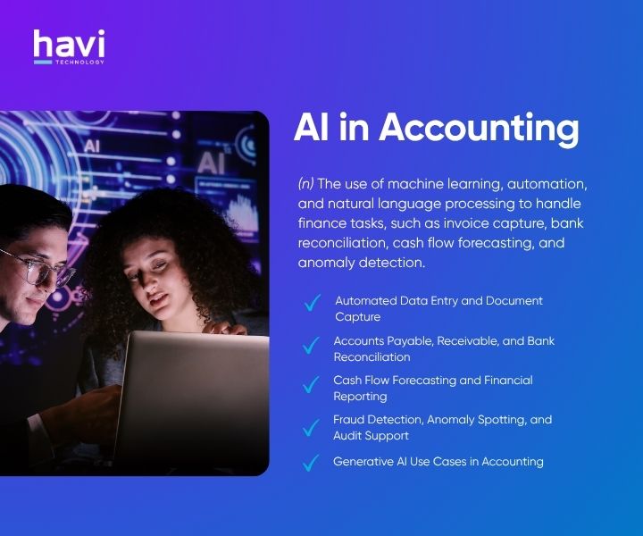 AI in accounting is the use of machine learning, automation, and natural language processing to handle finance tasks, such as invoice capture, bank reconciliation, cash flow forecasting, and anomaly d...